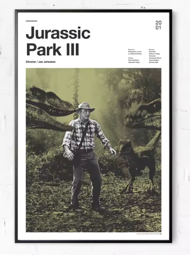 Jurassic Park III (2001) – Showcasing Dr. Alan Grant in a tense jungle standoff with raptors, framed in lush green tones.